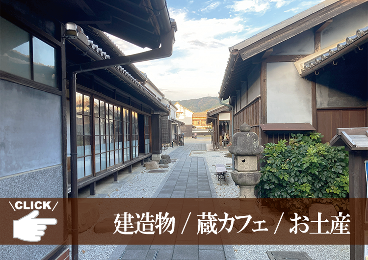 施設内の8つの建造物と広場、本物の蔵カフェ「こまや」、昔懐かしい菓子・雑貨・お土産の「ふたこまや」について